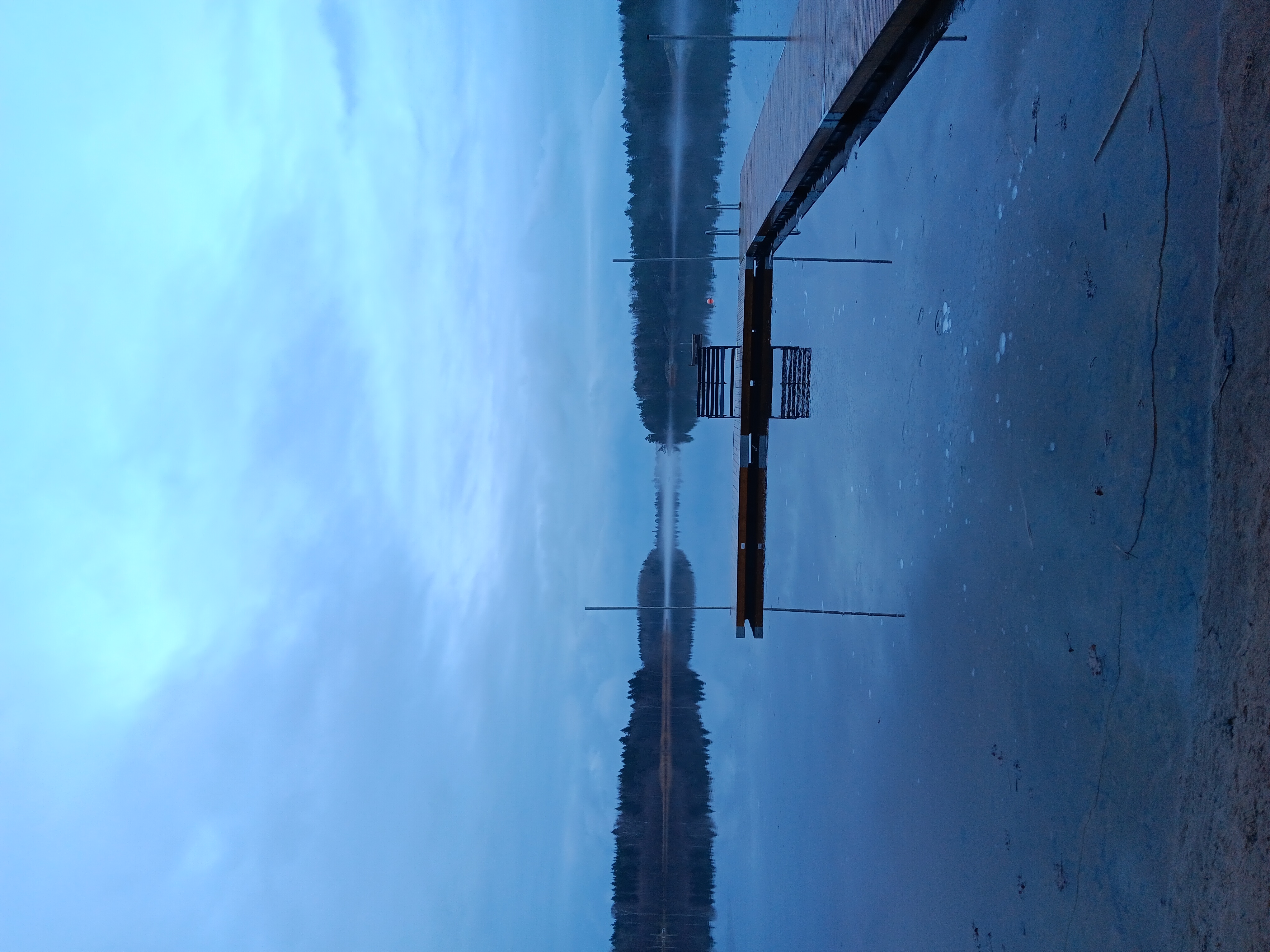 4 december 2025. Rådasjön, Norrtälje. Snart går solen ner, ljuset är blått. Det är plusgrader, ingen snö, lite dimma. Badplatsen är tom på folk. Eftermiddagen är stillsam.