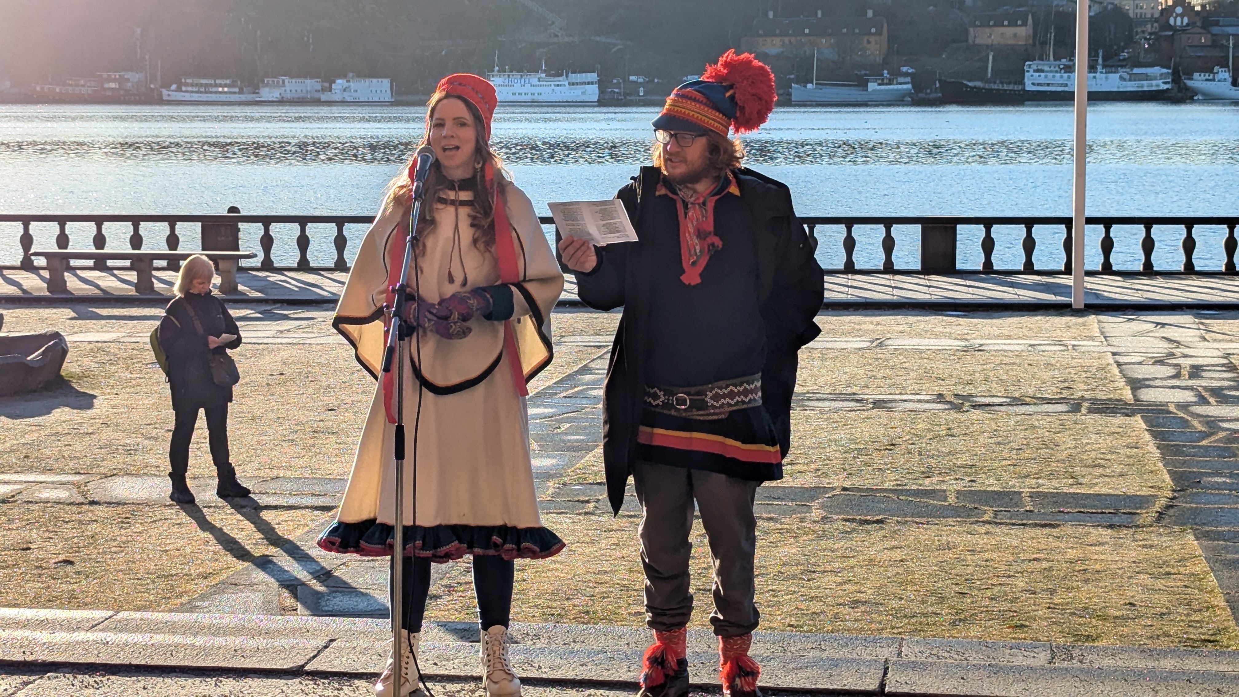 - sv Samisk nationaldag vid Stadshuset arrangerad av Sameföreningen i Stockholm. Flagghissning, nationalsång, tal och jojk. Officiella hälsningstal från Stockholms stads och regions politiker samt ambassadörer som representerar länder där urfolk lever. Flaggan överlämnades till Stockholms stad 2007. De officiella firandena kom igång 2013 efter några år av inofficiella firanden. På bilden: Elin Kåve, jojkartist från norska sidan av Sápmi och Sebastian Björkman, verksamhetsledare.