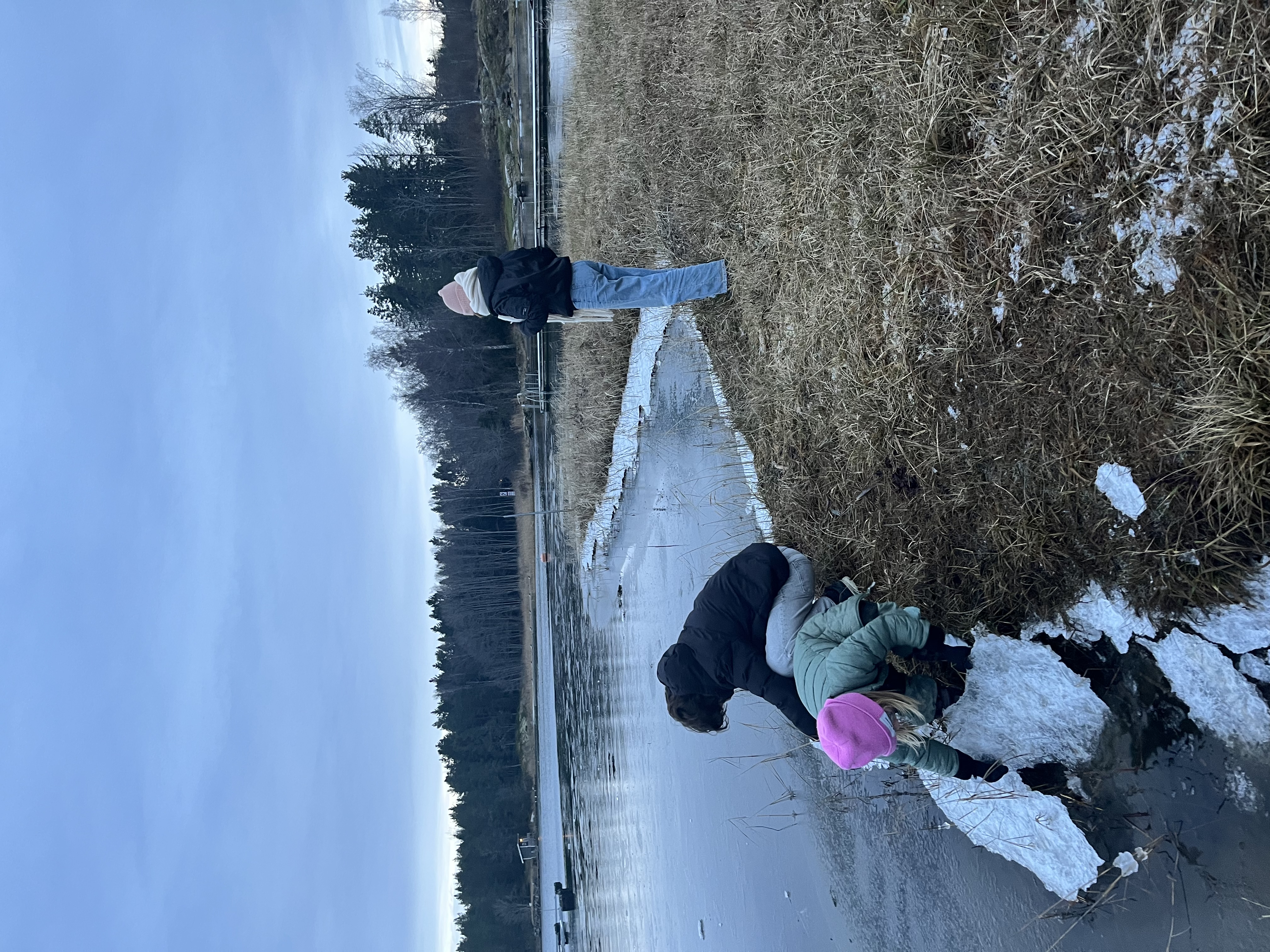 - sv En utflykt vid vattnet i Noret på Ljusterö, juldagen 2025. Barnen kastar macka med isflak.