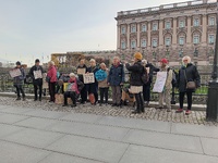 Tio poliser samlas för att mota bort eller vakta den stillsamma demonstrationsgruppen framför Sagerska. Polisen pratar, funderar och ringer (högre makt?). Jag står en bit bort och hör inte var och ens ord. Gruppen, 17 personer, står stillsamt kvar. Ja, gruppen är en stillsam grupp, ofarlig, tyst, icke hotfull - de står med tystnad, vänlighet och plakat.