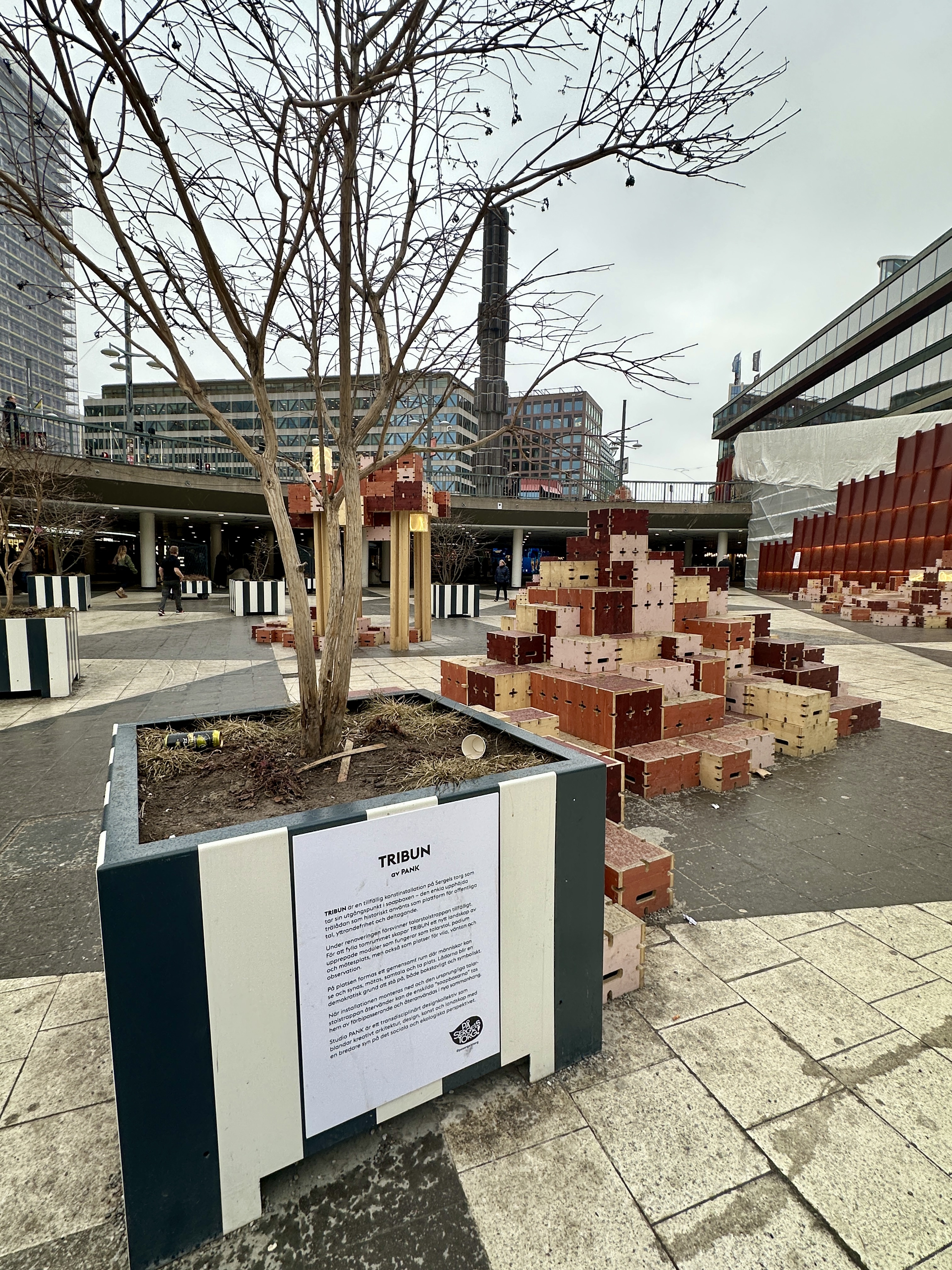 TRIBUN är en tillfällig konstinstallation på Sergels torg som tar sin utgångspunkt i soapboxen, den enkla upphöjda trälådan som historiskt använts som plattform för offentliga tal, yttrandefrihet och deltagande.