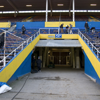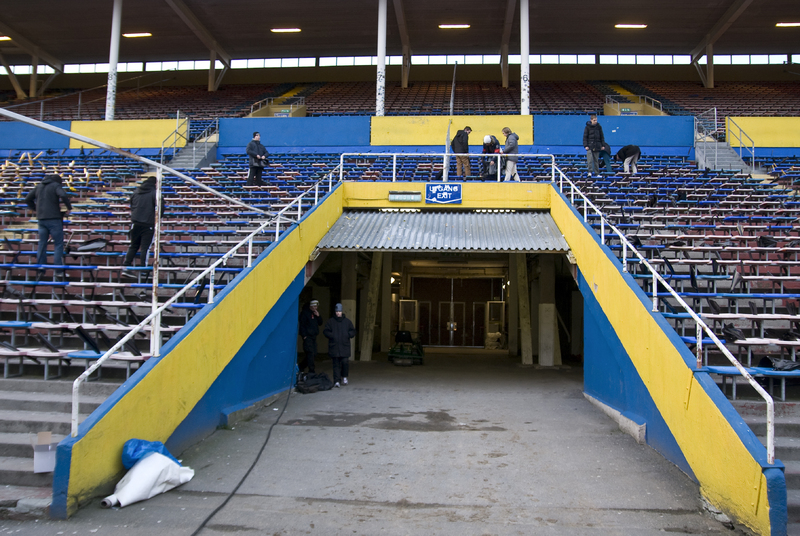 Förberedelser för sista tifot. Plast i olika färger rullas ihop och sätts på varje stol enligt uttänkt mönster.