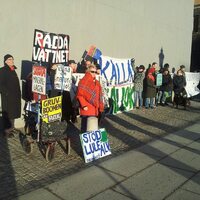 Vi samlades den 28e november 2013 för att visa vårt stöd för tre åtalade från Gállok - Kallak protesterna mot gruvexploateringen i Jokkmokk - Lule älv. Tre personer var åtalade för att de satt sig i vägen för prospekteringsföretaget JIMAB /Beowulf mining - och vägrade flytta på sig när polisen kom. Vi visade vårt stöd under en timme vid Riksbron - väl synliga från Riksdagshuset. Vi var ca 25 personer. Initiativet att samlas togs via en grupp på Facebook. Vi var både samer och icke-samer förenade i protest mot en vansinnig lagstiftning som tillåter total förstörelse av marker och vatten i hela Sverige och stöd till de som gör sitt yttersta för att stoppa detta vansinne.