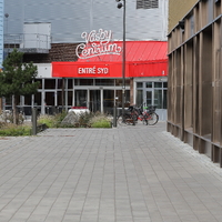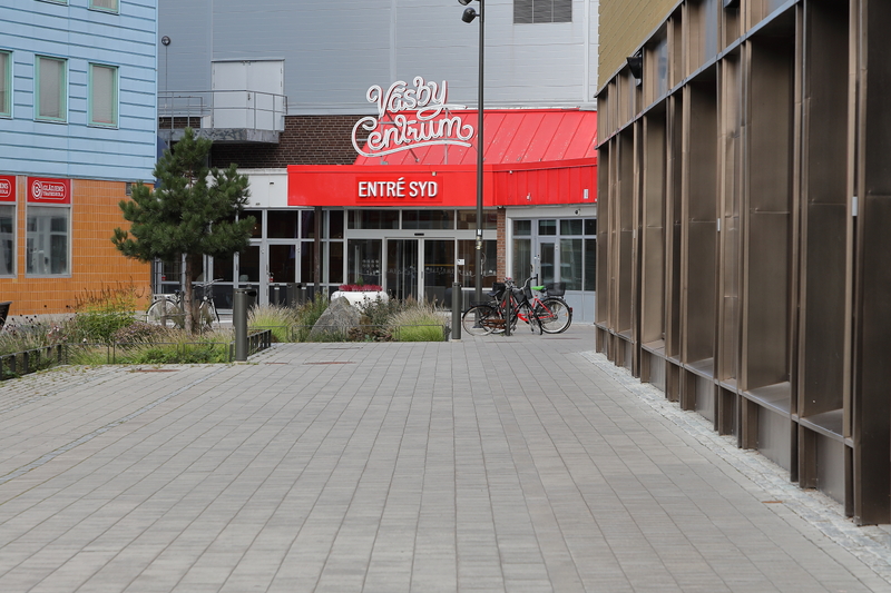 - sv En av fyra ingångar till Upplands Väsby centrum, denna vetter åt söder. Innanför är det ett typiskt förortscentrum för Stockholmsregionen.