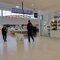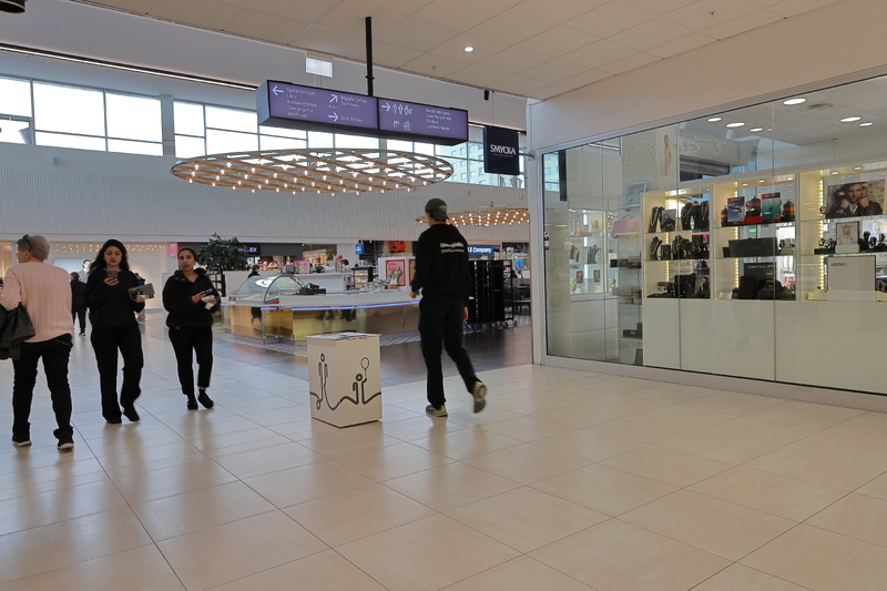 - sv De centrala delarna av Väsby centrum med ett inomhus torg där det finns ett kafé och en sushi restaurang. Runt om finns några affärer och ytterligare serveringar.