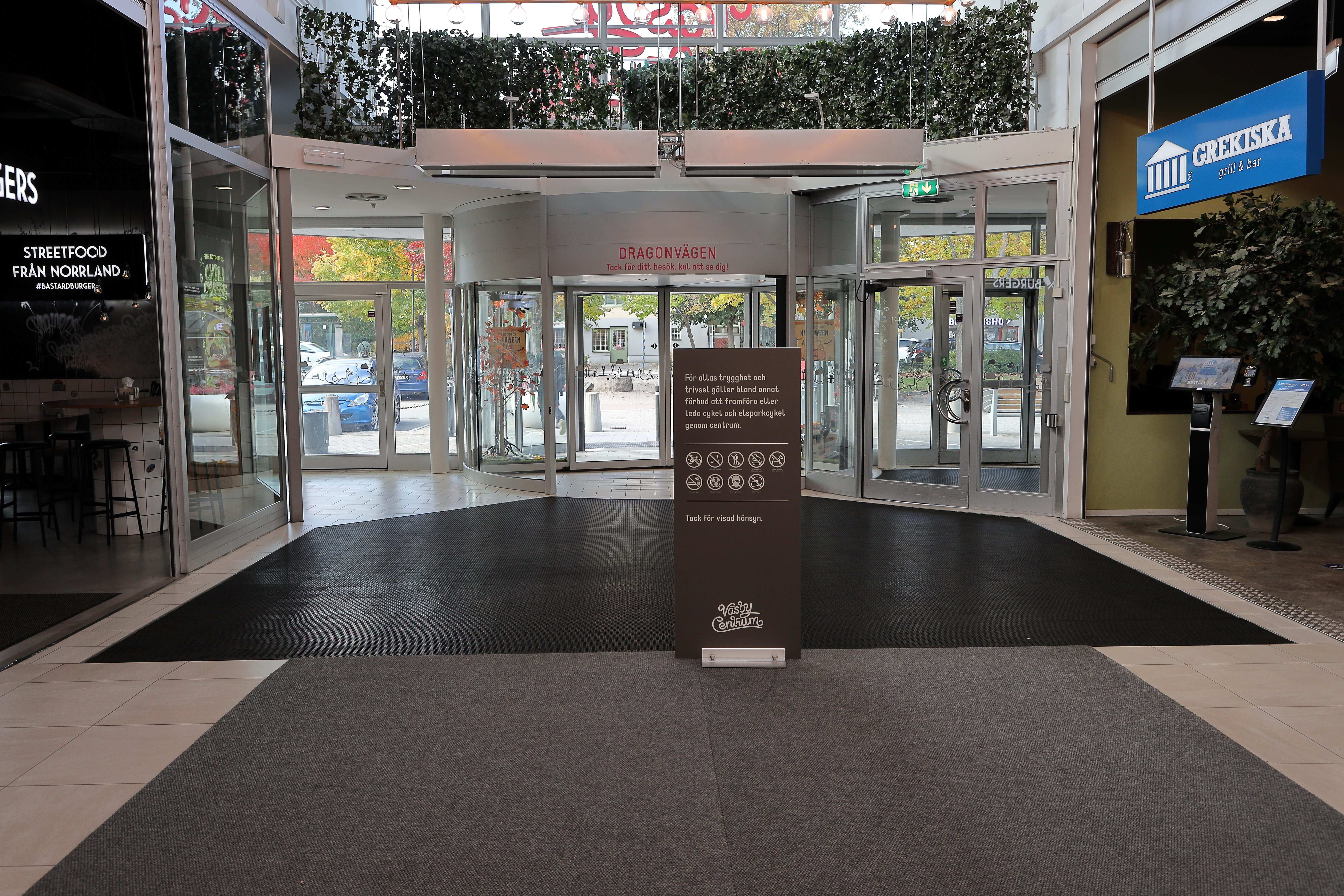 - sv Den västra utgången från Väsby centrum som är omgiven av lunchrestauranger.