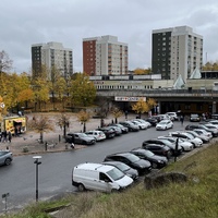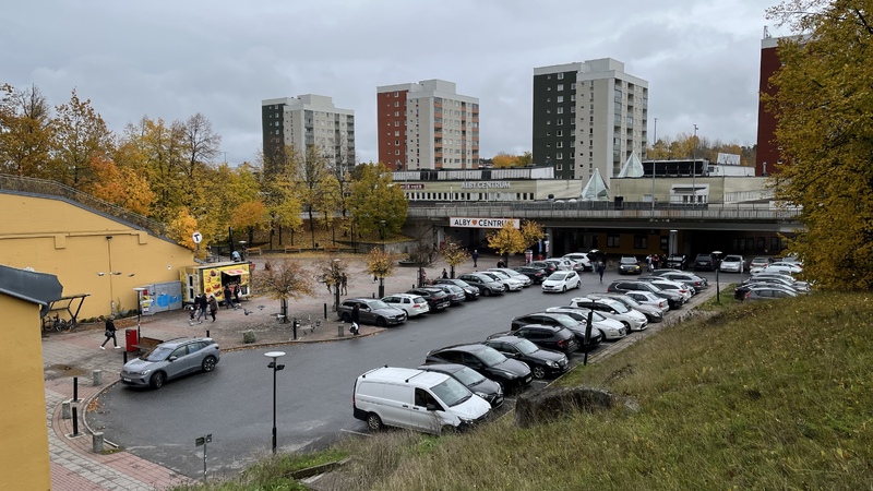- sv Alby centrum med ingång till tunnelbanan till vänster.