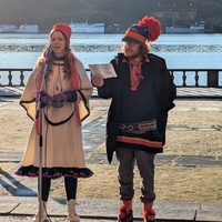 Samisk nationaldag vid Stadshuset arrangerad av Sameföreningen i Stockholm. Flagghissning, nationalsång, tal och jojk. Officiella hälsningstal från Stockholms stads och regions politiker samt ambassadörer som representerar länder där urfolk lever. Flaggan överlämnades till Stockholms stad 2007. De officiella firandena kom igång 2013 efter några år av inofficiella firanden. På bilden: Elin Kåve, jojkartist från norska sidan av Sápmi och Sebastian Björkman, verksamhetsledare.