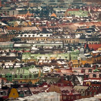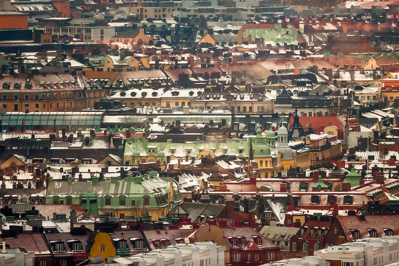 Står upp i Kaknästornet och letar vackra vyer. Hittar flera, ett av dem är detta där man ser taken kring norrmalm och vasastan i Stockholm city. Det blir ett myller av detaljer pga. att bilden blir platt av teleoptiken.