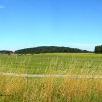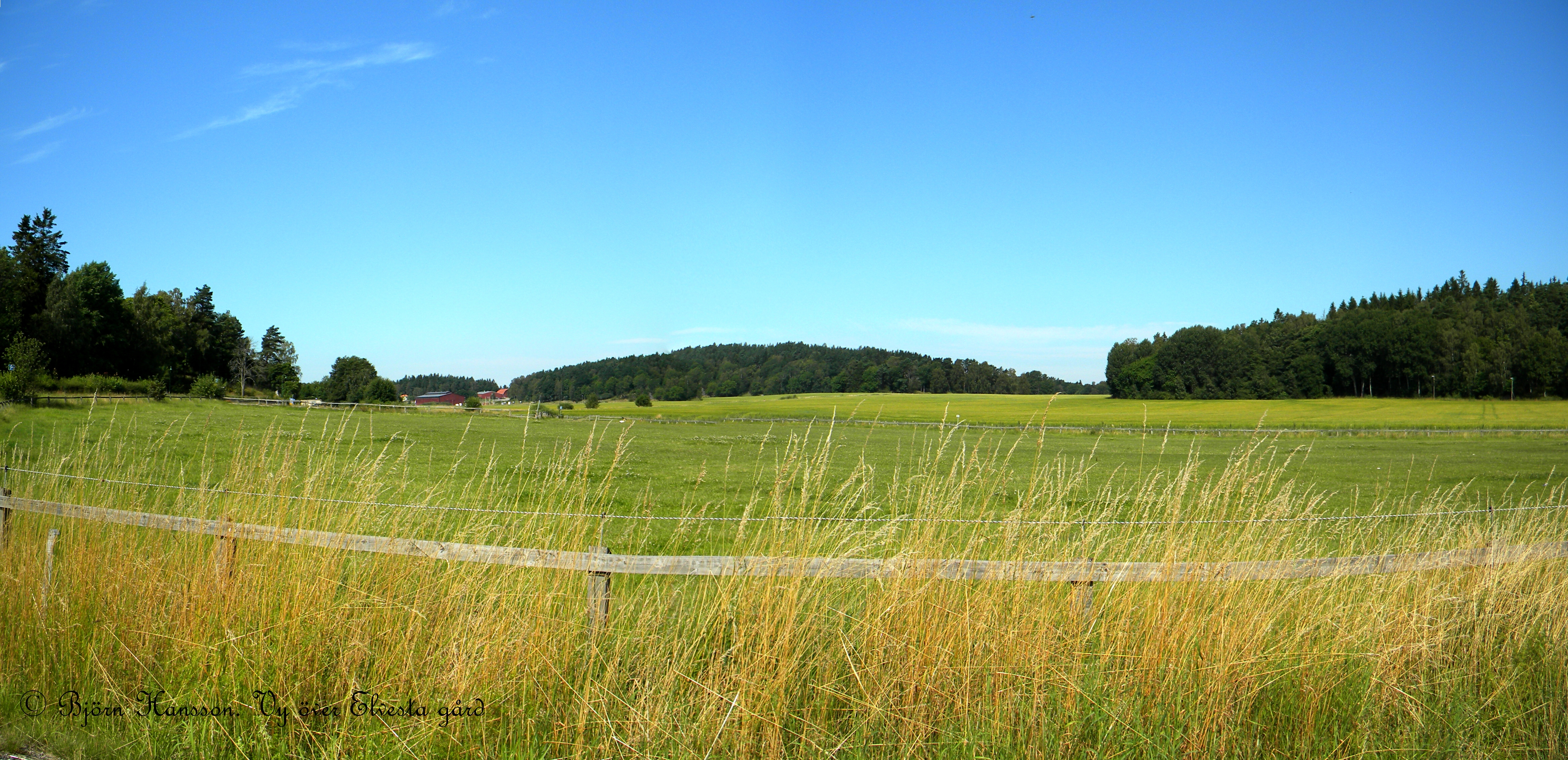 Vy över Elvesta gård Tumba. Panoramabild tagen fån gång och cyckelvägen mellan Tumba och Eriksberg.