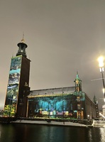 Nobeldans Denna bild är bara en av många som jag tog på kvällen den 3 December 2023, de är Nobel ljus show på Stadshuset, de var inte lätt att fota detta när de var iskallt