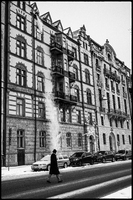 Beckholmsbron i kyla En man går över Beckholmsbron en kall vinterdag. Draperiet under bron har på något sätt att göra med att man lägger ner en ny elkabel i sundet.