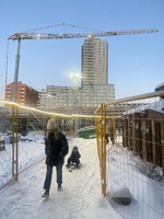 Vintermorgon i Årstaberg. Vintermorgon på tillfällig gångväg mellan de många byggarbetsplatserna i Årstaberg, november 2023.