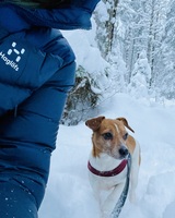 Snöpuls i Roslagen Snöpulsar bakom husknuten med bästa fyrbenta vännen Peggy.