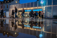 Reflexioner Den provisoriska tunnelbaneuppgången vid Slussen reflekteras i en vattenpöl.