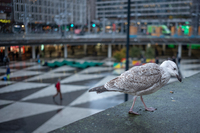Mås på plattan En ung fiskmås letar efter något ärbart på Sergels torg.