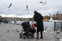 Måsattack En kvinna med barnvagn slänger ut lite mat till måsarna på Skeppsbron