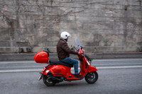 Vespa på Hornsgatan En man kör med sin färgstarka vespa på Hornsgatan på Södermalm.