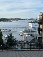 Tre båtar vid Nacka Strand Pendelbåtar och finlandsbåt sedd från torget vid Nacka Strand.