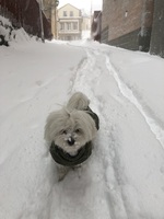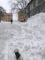 Snö och liten hund, Mars 2023 Massor av snö på Nytorgsgatan, inte helt lätt att vara liten hund med korta ben