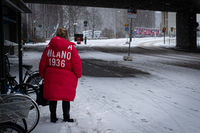 Storjackan En kvinna med en väldigt stor dunjacka väntar på bussen vid Ropsten.