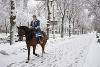Polispatrull på Djurgården En polis kommer ridande i snöfallet utanför Nordiska museet.