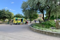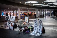 Porträttmålare En man målar porträtt från en mobiltelefon på Plattan.