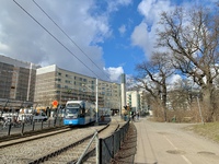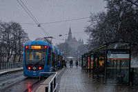 Spårvagn i snöväder Spåvagnen anländer till stationen utanför Liljevalchs konsthall i typiskt aprilväder