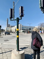 Blå planklet vid Slussen Några personer passerar det blå planket som var uppsatt vid ombyggnaden av Slussen