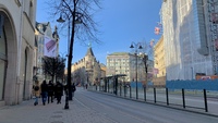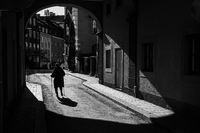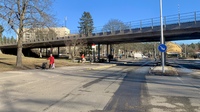 Stavgång på Danderydsgatan En kvinna går i vårsolen på Danderydsgatan