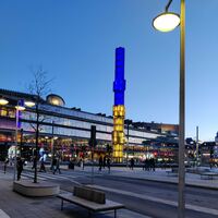 Solidaritet med Ukraina Gick förbi Sergels torg och såg att glaspelaren hade färg från Ukrainas flagga.