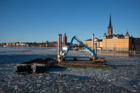 Pråmar på Riddarfjärden Pråmar och andra byggrejor till Slussenbygget.