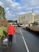Essingeleden En man går med en barnvagn på Solnavägen med Essingeleden i bakgrunden.