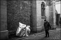 Motorcykel utanför Tyska kyrkan En man går förbi en övertäckt motorcykel vid Tyska kyrkan i Gamla stan.