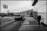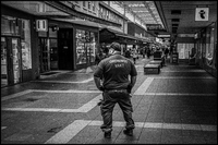 På vakt i Vällingby centrum En väktare står i Vällingby centrum