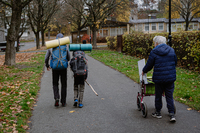 På hajk i Vällingby En vuxen och ett barn med vandrarutrustning i Vällingby centrum på höstlovet.