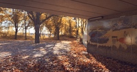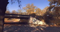 Fisksätra. Bron till Fisksätra holme Dimmig solnedgång.