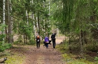 Picknick vid havet På väg mot stranden,genom skogen, med matsäcken i ryggsäckarna. Hundarna springer och jagar varandra snart ska de doppa tassarna i havet och gräva gropar i sanden.