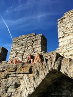 Semester. Jag och min bästa vän solar i bikini på visbymuren, på Gotland. Vi har bara fötter och solen hettar mot muren. Vi "steker". Resan hit med buss, pendel och båt var värt det.