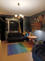 Vardagsrum Jag bor i en hyrestvåa i Råcksta och målade väggarna mörkblå när jag flyttade hit. Eftersom sängen står här inne har jag plats för ett separat arbetsrum. Trasmattan har min moster vävt.