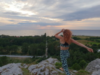Sista sommarlovsdagen på landstället. Bilden är fotograferad på Gotland, vid ett kalkbrott. Jag håller i en barkbåt som jag snart ska låta segla iväg. Jag har färgat håret rött och bär de trendiga tofflorna på denna tid.