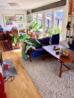 #vardagsrum Jag använder mitt vardagsrum som matplats, arbetsplats, för umgänge och vila.Jag har bord och stolar, soffa och fåtöljer, bokhyllor och ett ärvt vitrinskåp, konst, böcker och olika små saker som väcker minnen och kreativitet. Jag har få växter och ingen TV alls.Rummet förändras och möbleras om ibland beroende på behov. Det är ofta matrum då mitt kök är för litet för ett bord. Det kan bli ett gästrum med sovplats i soffan eller bli ett arbetsrum med symaskin eller dator på matbordet eller ett galleri och mötesplats för konst och konstnärsvänner. Det har varit samlingsplats för stora möten och festrum för familj vid helger.Det är helt enkelt ett vardagsrum.
