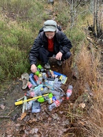 Skräp Vi skulle ta en promenad i skogen. Men vi fastnade vid sjön. Vi skulle bara plocka upp en flaska som guppade i strandkanten. Men detta blev fångsten. Så mycket plast!