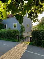 En härlig vårdag Laddar inför en ny arbetsvecka efter en rolig barnvaktshelg. Barnbarnen Vega och Ruben med det prisbelönta svarta huset i bakgrunden .