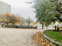Höstdis Sen november, snart december. Juldekorationer på plats på de flesta balkongerna vid Sjövikstorget.