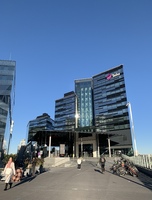 Skyskraporna på Liljeholmskajen byggs. Lyftkranar intill det svarta höghuset på kajen.