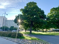 Man promenerar på Sjöviksvägen. Man passerar under blommande vårträd på Sjöviksvägen.