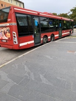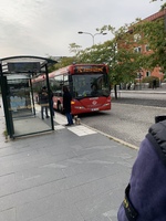 Buss En röd buss av större typ. En vidareutveckling av bilen för att kunna transportera fler personer på ett effektivare sätt. Det ryms ca 50 personer i en buss vilket även drar ner bensinkostnad och utsläpp. Motorbussen fick sitt genombrott i Tyskland på 1890-talet. I framtiden kan man omkonstruera interiör för att kunna få plats med fler på ett bättre sätt