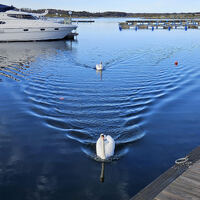 - sv Jag var med min familj på västkusten, och vi skulle gå över bryggan till frukosten, och då såg jag två svanar som flöt förbi och gjord fina vågor efter sig, så då bestämde jag mig för att ta ett kort.