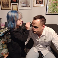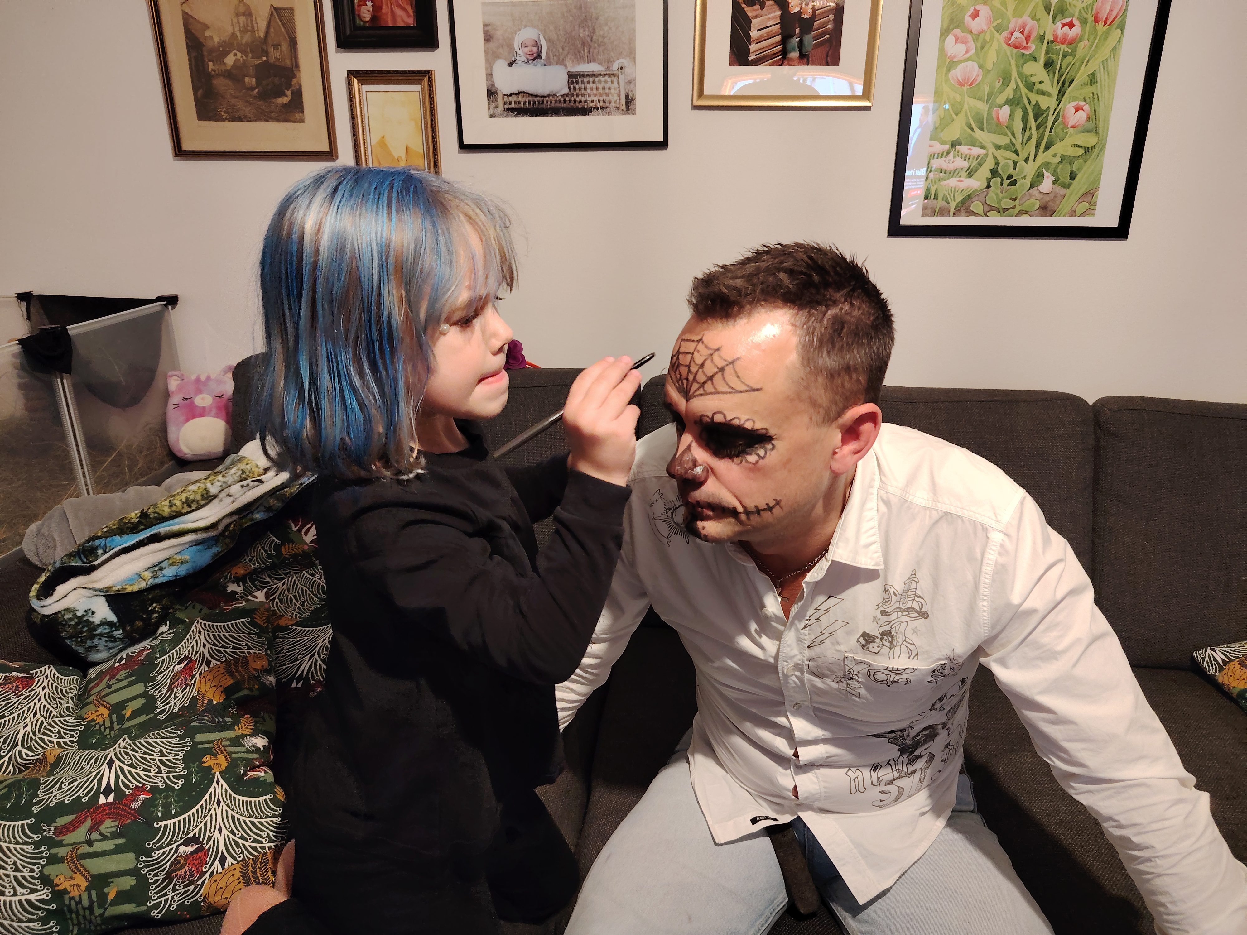 - sv Sminkning och förberedelser innan bus eller godis. Dotter sminkar pappa.